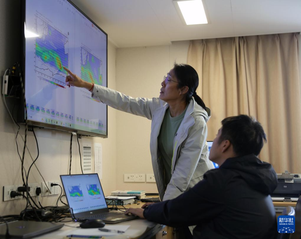 这是“雪龙2”号随船气象保障员刘素芳(左)在研判天气情况,规划航行路线。新华社记者 黄韬铭 摄