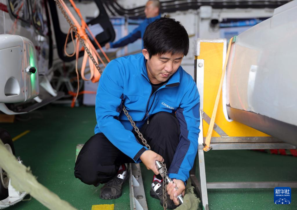 这是“雪龙2”号直升机机组成员毕凌峰在拧紧直升机固定件。新华社记者 黄韬铭 摄