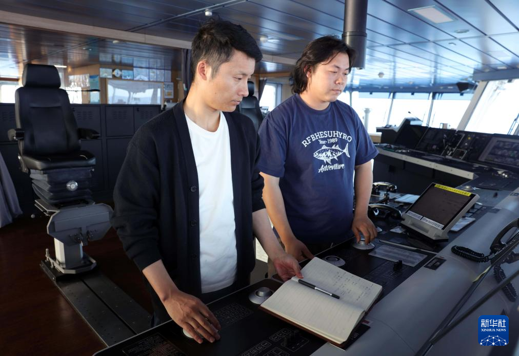 这是“雪龙2”号大副祝鹏涛(左)、水手陈栋彬在驾驶台调整航向。新华社记者 黄韬铭 摄