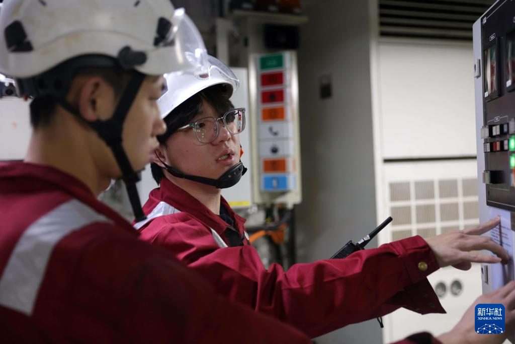 这是“雪龙2”号实习三管轮陈星宇(右)在检查机舱设备。新华社记者 黄韬铭 摄