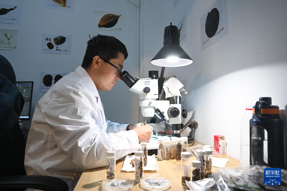 11月4日,在内蒙古呼和浩特市蒙草生态环境(集团)股份有限公司种业中心生态种质资源库,科研人员在显微镜下清理种子表皮。新华社记者 贝赫 摄