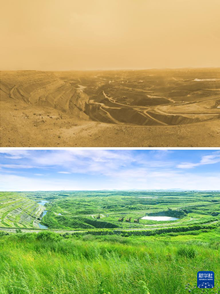 拼版照片:上图为2016年拍摄的生态修复前的内蒙古呼伦贝尔市扎赉诺尔露天矿区;下图为2021年拍摄的生态修复后的内蒙古呼伦贝尔市扎赉诺尔露天矿区。新华社发