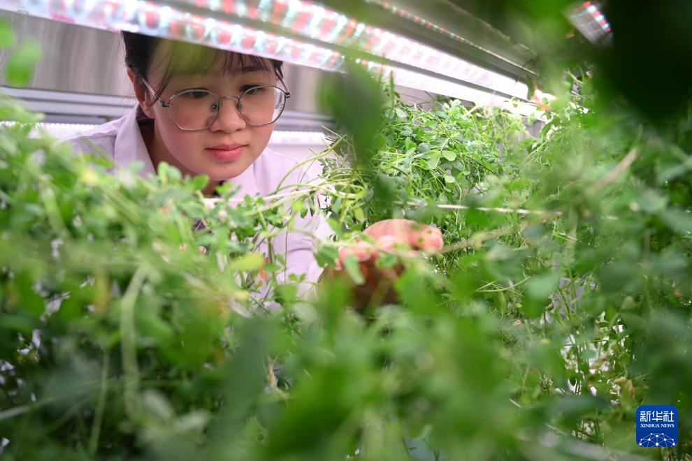 11月4日,科研人员在内蒙古呼和浩特市蒙草生态环境(集团)股份有限公司种业中心的育种加速室查看苜蓿生长情况。新华社记者 贝赫 摄