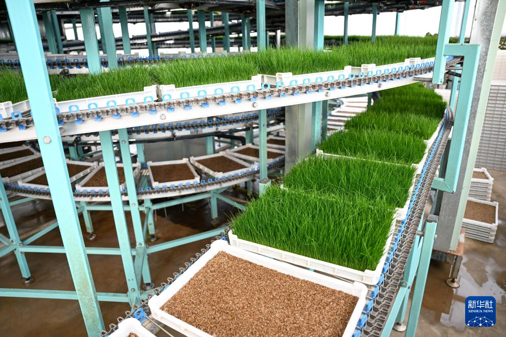 11月4日在内蒙古呼和浩特市蒙草生态环境(集团)股份有限公司种业中心拍摄的螺旋塔式牧草工厂。新华社记者 贝赫 摄
