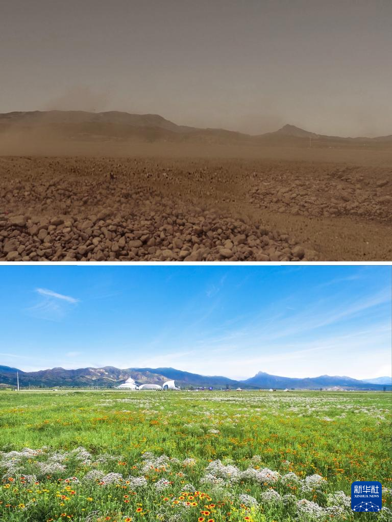 拼版照片:上图为2012年6月拍摄的生态修复前的内蒙古呼和浩特市近3万亩废弃地;下图为2017年8月拍摄的生态修复后的内蒙古呼和浩特市近3万亩废弃地,也就是如今的敕勒川草原。新华社发