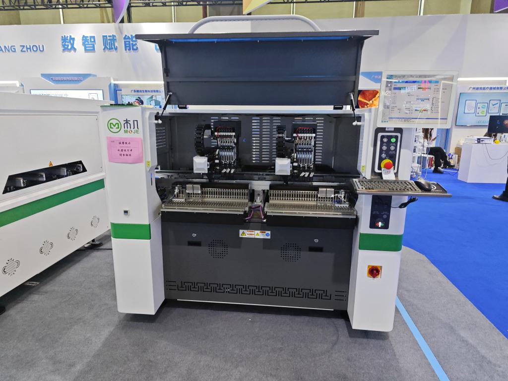 广东木几智能装备有限公司展出的多功能贴片机,引起了来访者的兴趣。公司副总经理温妮介绍,这款多功能贴片机,与同类产品相比提速35%以上,极大提升了电子元器件生产效率。