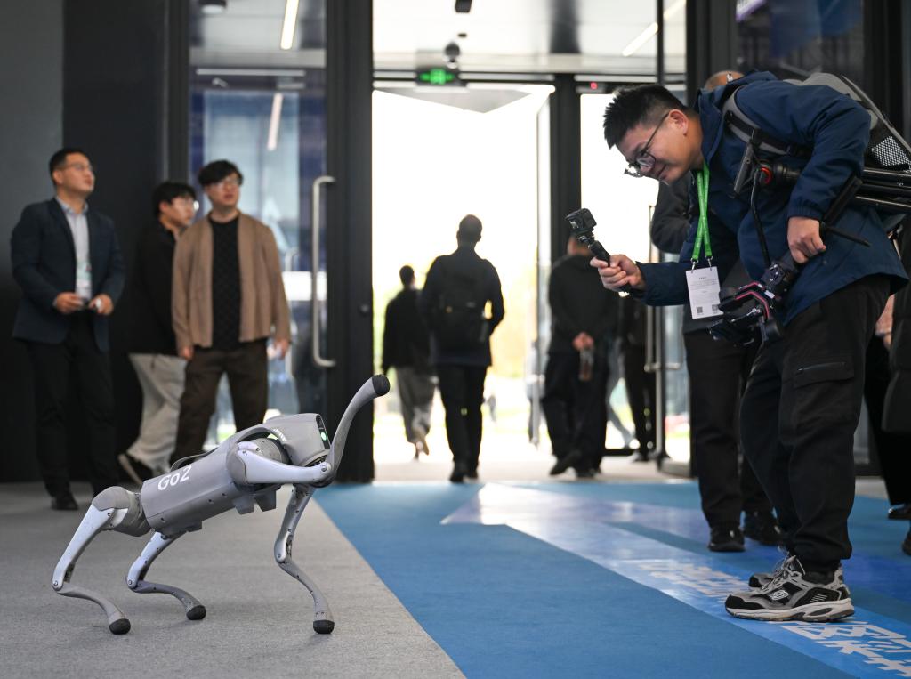 11月19日,在2024年世界互联网大会“互联网之光”博览会上,参观者与一款智能机器狗互动。