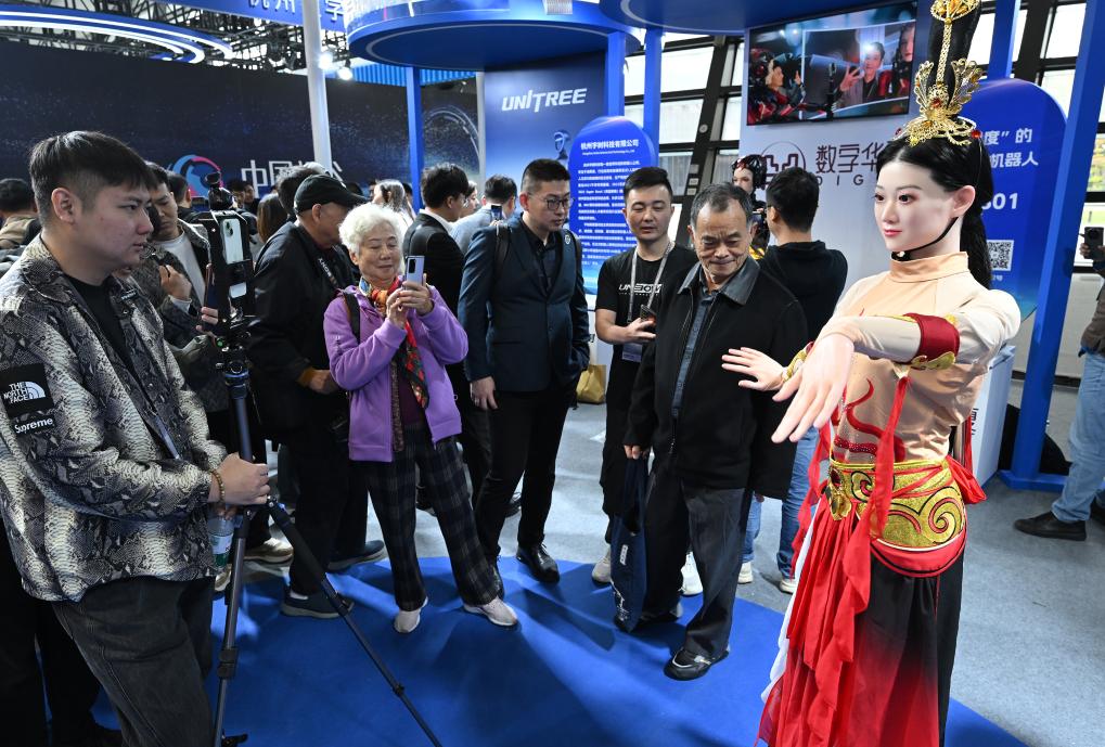 11月19日,在2024年世界互联网大会“互联网之光”博览会上,一台人形机器人(右一)与参观者互动。