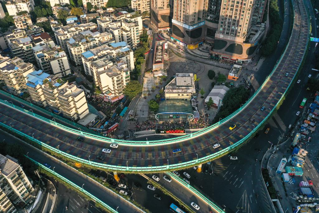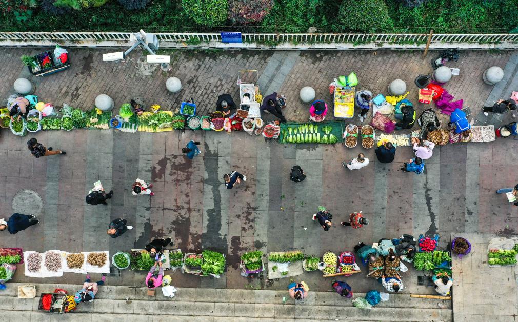 为了报道好这趟“惠农专线”,我先后四次蹲点拍摄。一个阳光明媚的早晨,我来到菜农们临时卖菜的地点,通过无人机俯瞰城市的车水马龙。镜头里,乘坐252路“惠农专线”来到城里卖菜的菜农们聚拢在一起,阳光透过高楼和立交桥,照在临时菜场上,人间烟火和城市温度在这一刻具象化呈现。