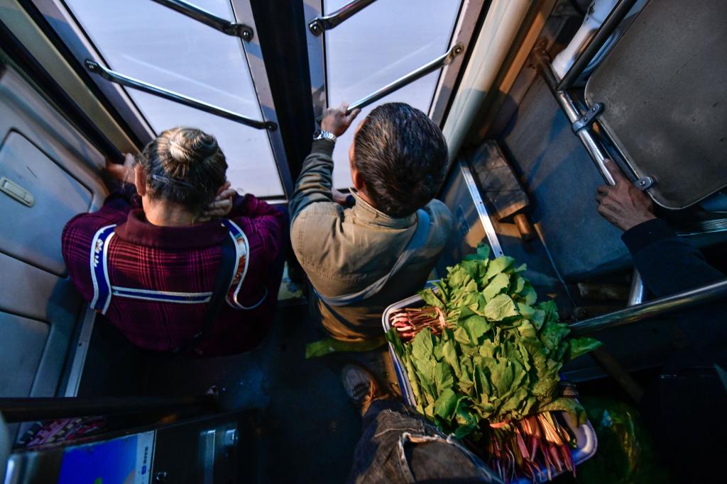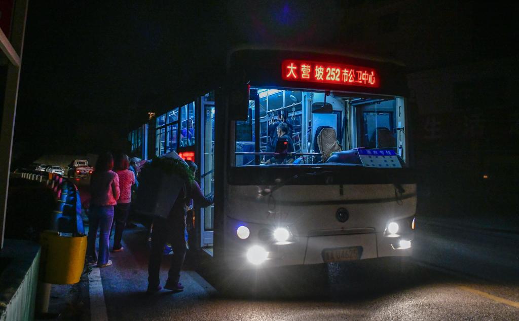 车站早已摆满了菜农们的农产品。五点五十分,252路“惠农专线”开过来了。公交车司机张桂林打开车内的灯,放下货架,帮着菜农们把菜筐搬到车上。不到十分钟,各种盛满新鲜果蔬的背篓、菜篮、编织袋已经塞满车厢货架。
