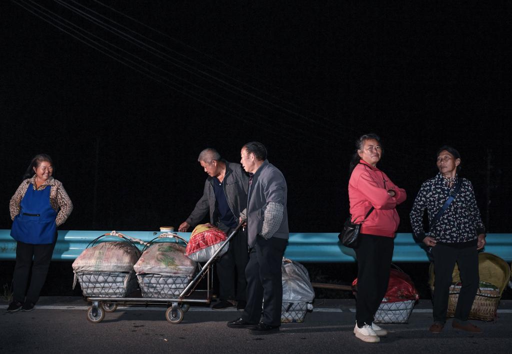村民在贵阳市乌当区水田镇定扒村候车,准备乘坐252路“惠农专线”公交车进城卖菜(11月7日摄)。