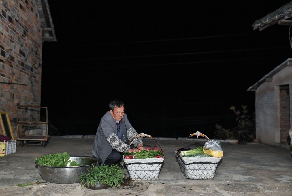 谢大林与其他菜农一样,头天傍晚就把需要进城售卖的萝卜、青菜、韭菜采摘好了。出发前,谢大林与妻子又去地里摘了一些小葱和香菜,用稻草捆好,放在菜篓里面。