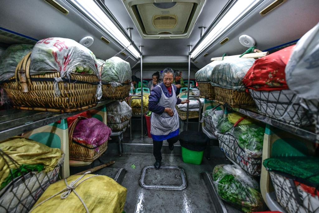 在贵阳市乌当区水田镇定扒村,菜农登上252路“惠农专线”公交车,准备进城卖菜(11月7日摄)。