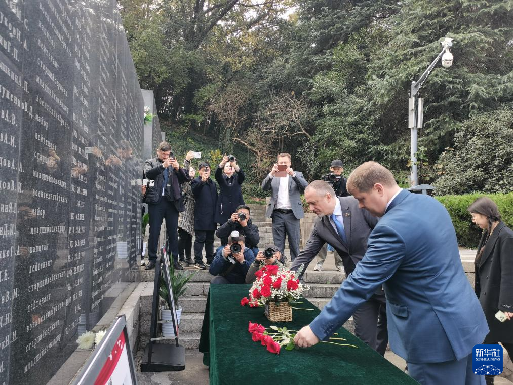 11月22日,在江苏省南京市的南京抗日航空烈士纪念馆,白俄罗斯驻沪总领事安德烈夫(右二)、俄罗斯驻沪副总领事日日金(右一)在苏联英烈碑前献花。新华社记者 蒋文茜 摄
