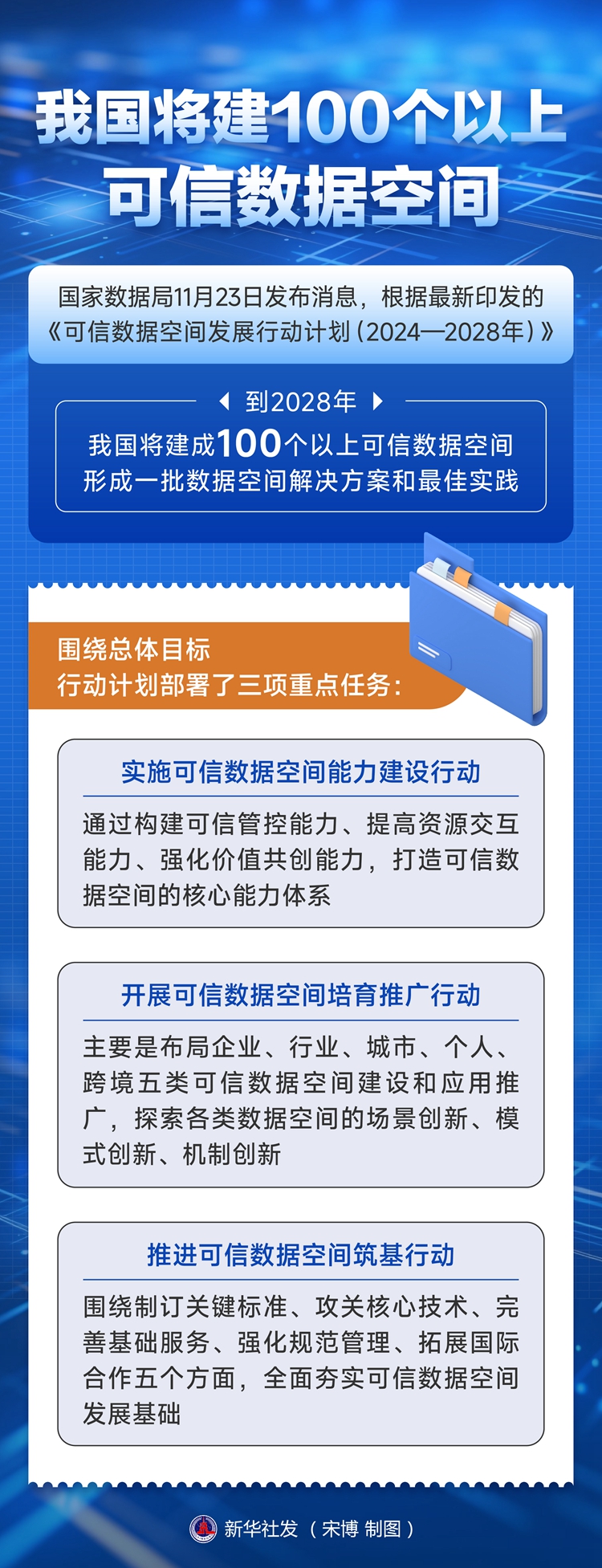 新华社北京11月23日电(记者严赋憬)国家数据局23日发布消息,根据最新印发的《可信数据空间发展行动计划(2024—2028年)》,到2028年,我国将建成100个以上可信数据空间,形成一批数据空间解决方案和最佳实践。