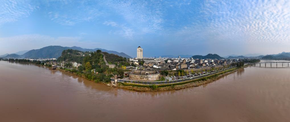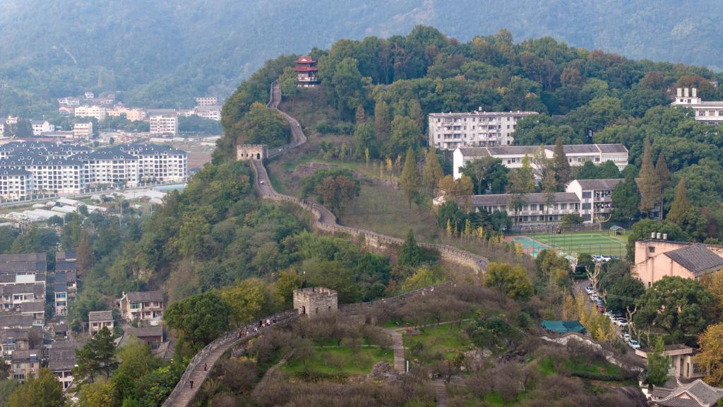 11月22日在浙江临海拍摄的黄大树参与修复的台州府城墙(无人机全景照片)。
