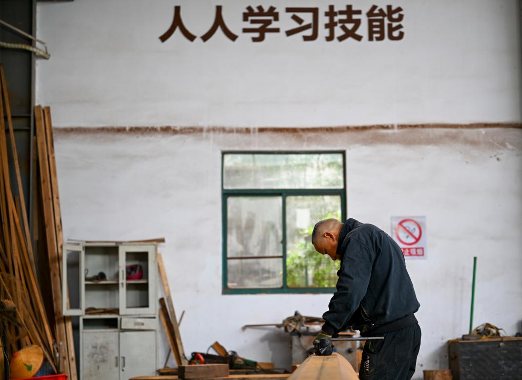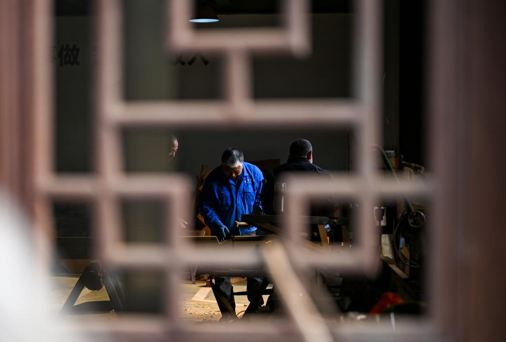 11月22日,在“古建共富工坊”,木工师傅在给木材划线。