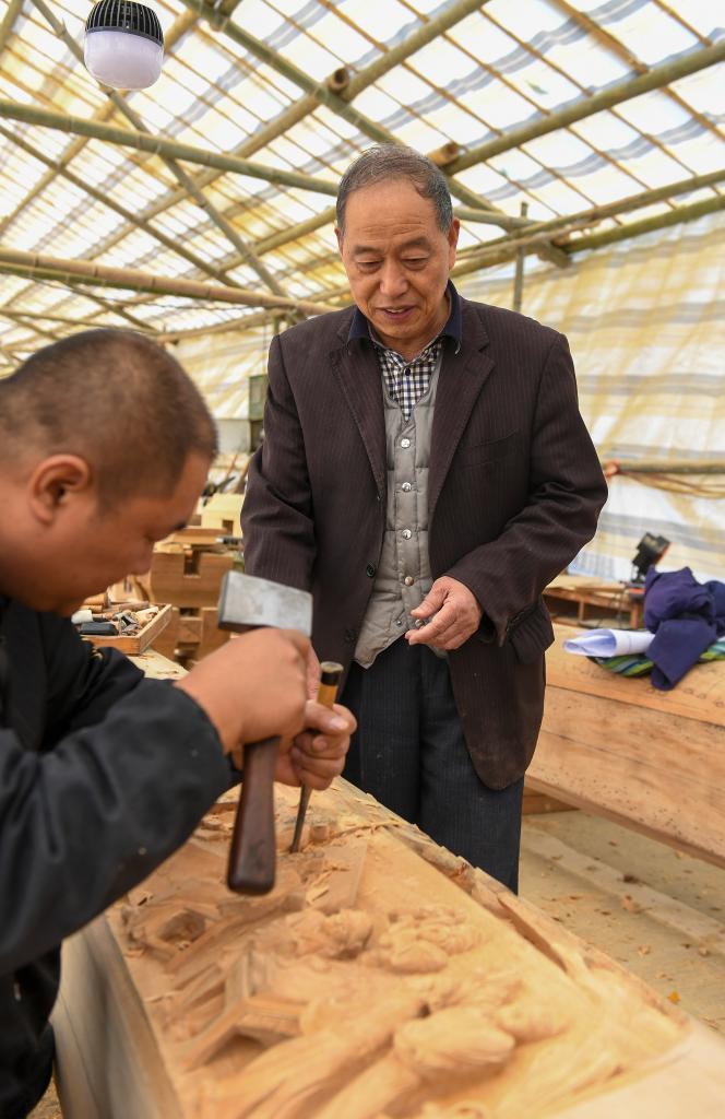11月22日,在浙江临海汇溪镇浚头村,黄大树指导当地工匠雕刻梁上的故事画。