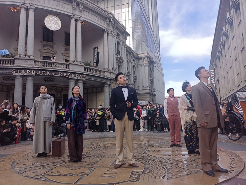11月16日,天津金街商圈大铜钱广场,曹禺的经典作品《日出》片段正在沉浸式上演。新华网 崔晨晨 摄