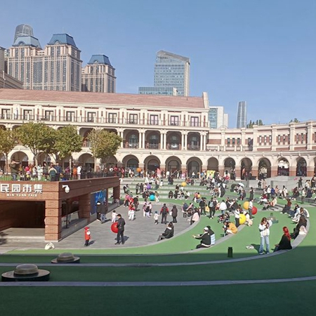 民园广场位于五大道的中心区域,其前身是始建于1920年的民园体育场,这里也是中国的第一个灯光足球场。2012年,和平区启动了民园体育场保护利用提升改造工程。经过提升改造,现在的民园广场已经成为中西合璧的“城市会客厅”。