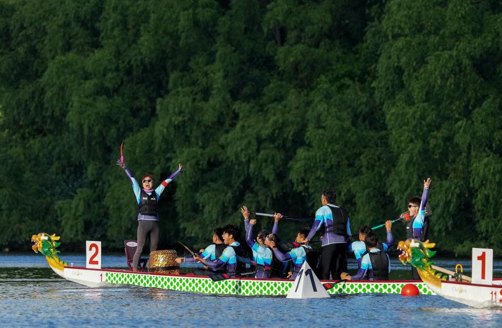 11月25日,云南队在决赛后庆祝。最终云南队获得一等奖。当日,第十二届全国少数民族传统体育运动会混合组(小龙舟)500米直道赛在海南省三亚市举行。新华社发(杜笑微摄)
