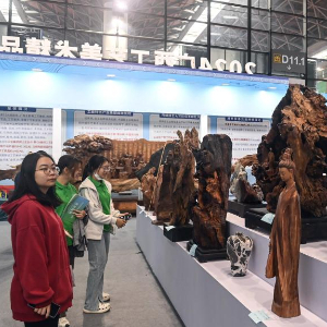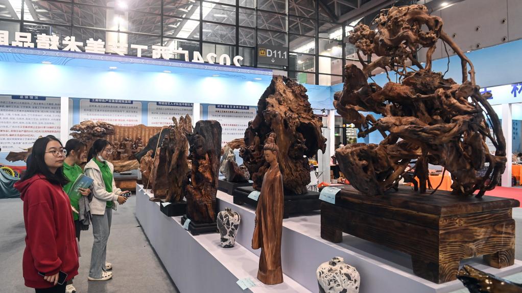 11月24日,在南宁国际会展中心,观众在观赏木质工艺美术精品。当日是2024年世界林木业大会公众开放日,观众和客商前来参观选购。新华社记者张爱林 摄