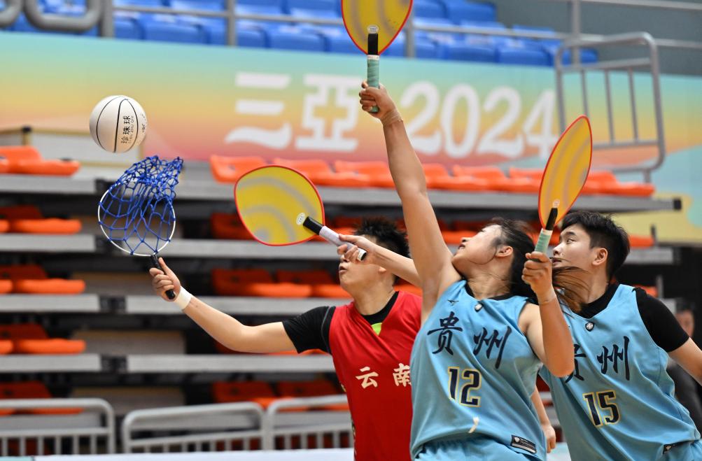 11月25日,贵州队球员孟繁霞(中)、余迪(右)在比赛中阻挡云南队球员邱雪接球。当日,在海南三亚举行的第十二届全国少数民族传统体育运动会珍珠球女子小组循环赛第三轮比赛中,贵州队47比45战胜云南队。新华社记者 郭程 摄