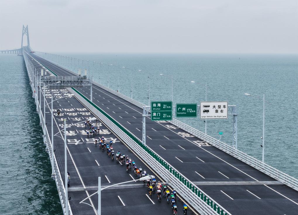 11月24日,参赛选手在港珠澳大桥上骑行(无人机照片)。新华社记者 刘大伟 摄