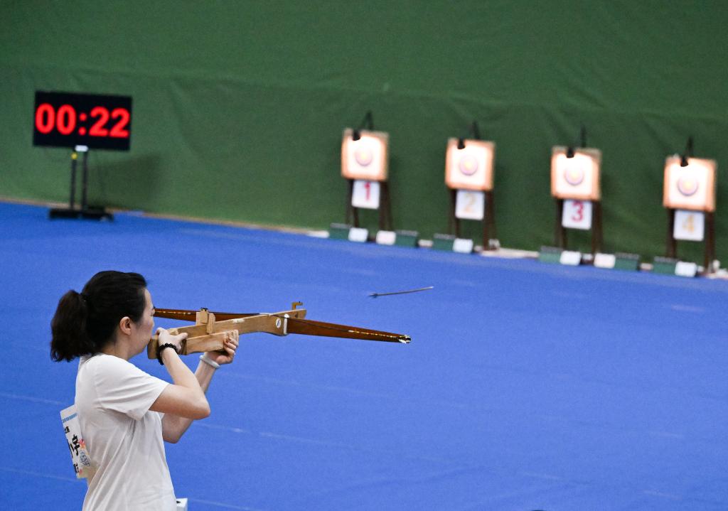 本届全国少数民族传统体育运动会上,射弩比赛在上海外国语大学三亚附属中学体育馆进行。运动员绷紧了神经,一手持弩,一手托举,目视前方,拉弦、装箭、瞄准、击发,一支支离弦之箭直奔靶心而去。一旦有运动员击中10环,现场总会响起一阵阵欢呼声。