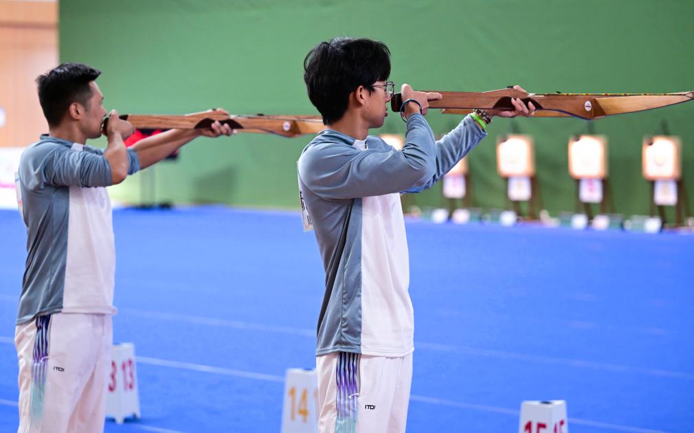 11月25日,四川队选手张发清(右)和白锋在比赛中,最终四川队获得三等奖。当日,第十二届全国少数民族传统体育运动会射弩民族传统弩混合团体决赛在海南三亚举行。新华社记者 周牧 摄