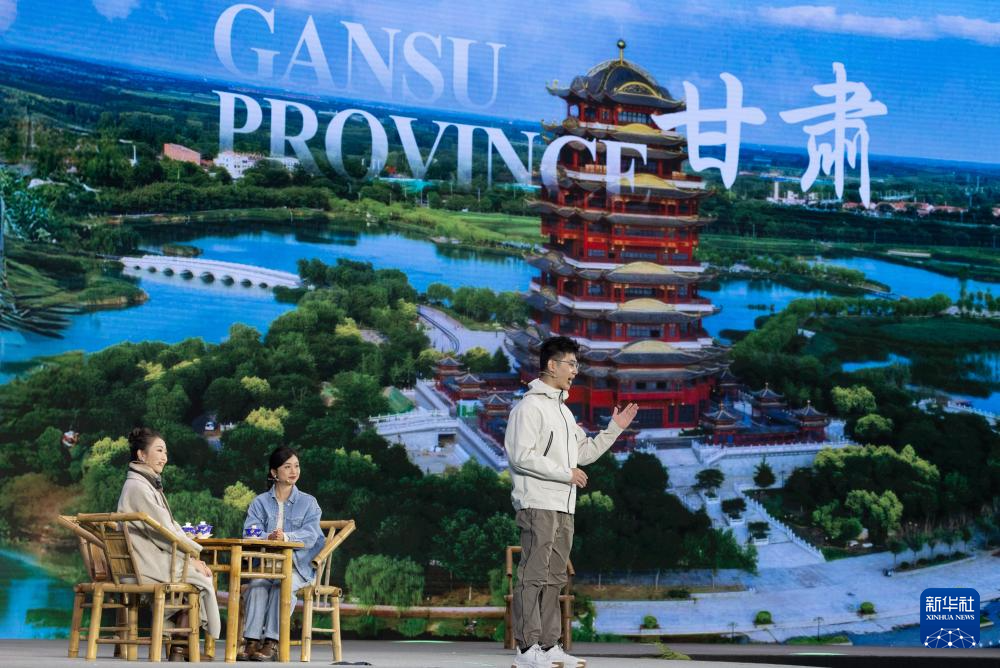 11月26日,在2024全球熊猫伙伴大会上,来自四川、甘肃、陕西的三位年轻人在推荐生态旅游资源。新华社记者 江宏景 摄