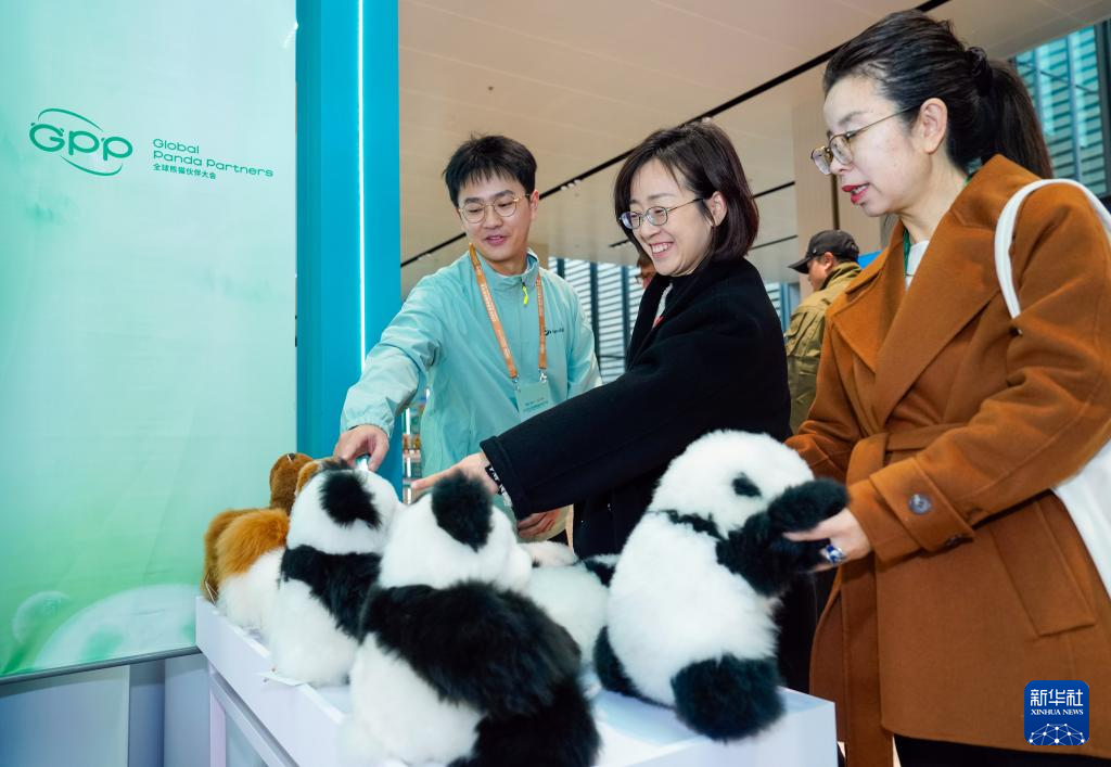 11月26日,嘉宾在2024全球熊猫伙伴大会会议间隙参观大熊猫文创产品。新华社记者 江宏景 摄