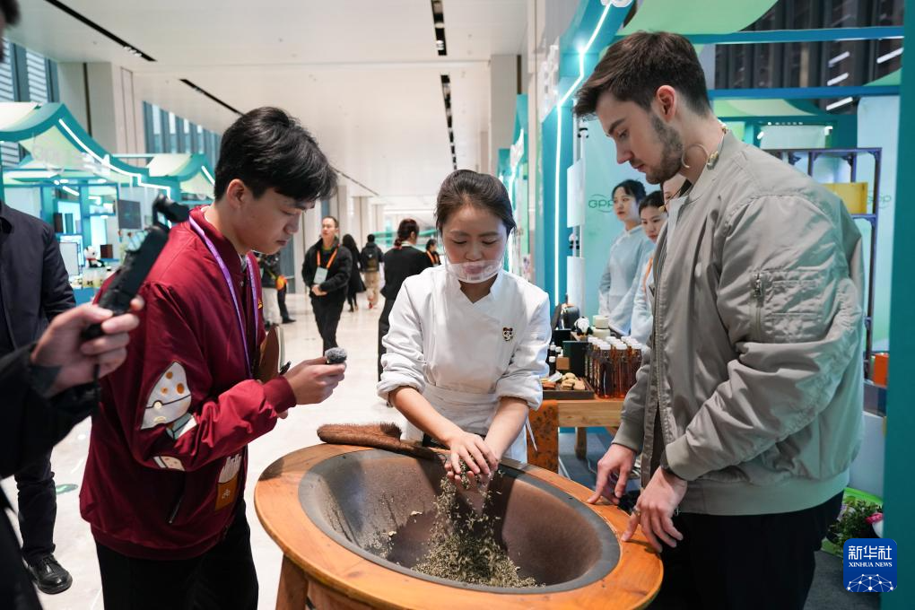 11月26日,在2024全球熊猫伙伴大会会场,外国嘉宾了解雅安茶制作工艺。新华社记者 胥冰洁 摄