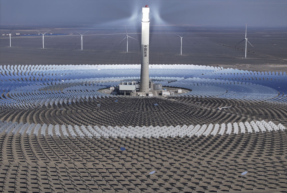 这是2024年9月12日在新疆哈密市伊吾县淖毛湖镇拍摄的国家光热示范项目——熔盐塔式50兆瓦光热发电站(无人机照片)。新华社记者 胡虎虎 摄