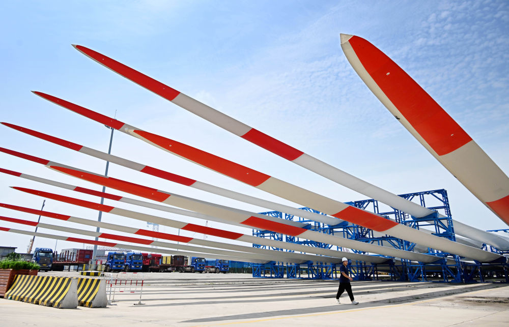 2024年8月13日,工作人员从山东港口烟台港蓬莱港公司码头堆放的风电设备旁经过。新华社记者 李紫恒 摄
