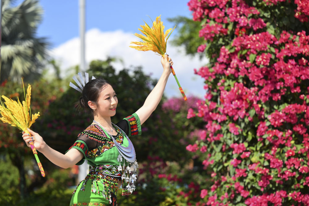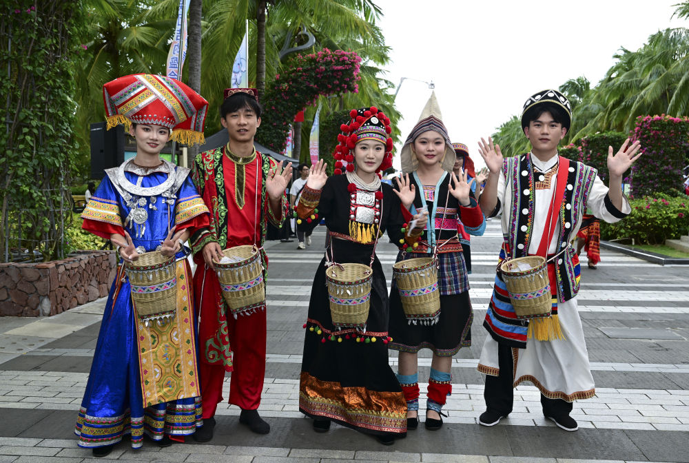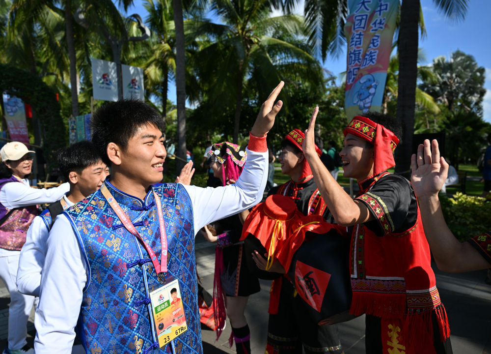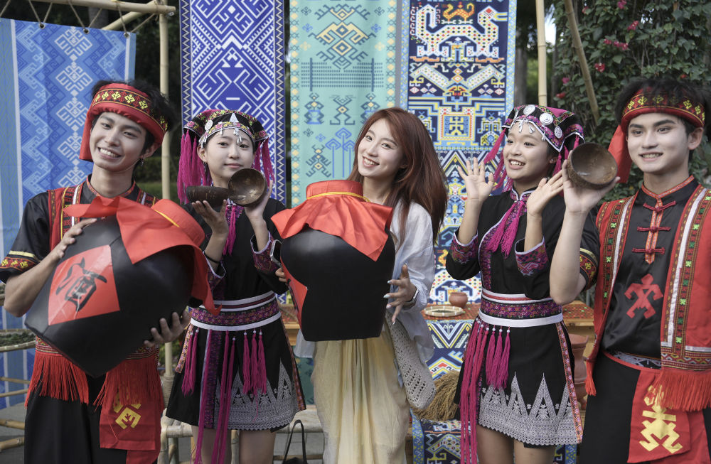 ↑演员欢迎广西代表团成员参加活动。新华社记者 孙凡越 摄