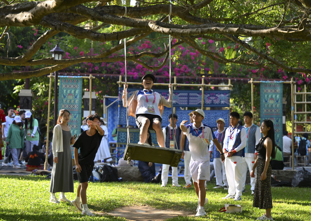 ↑一名运动员在活动现场体验秋千。新华社记者 陈泽国 摄