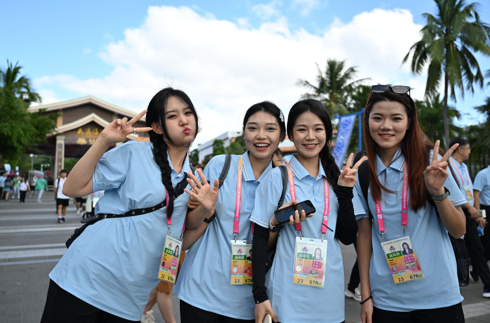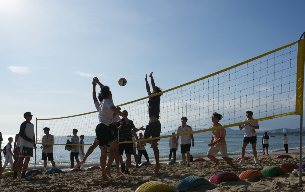 ↑运动员在游艺区体验沙滩排球。新华社发(杜笑微摄)