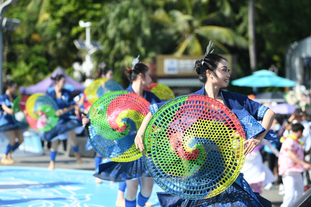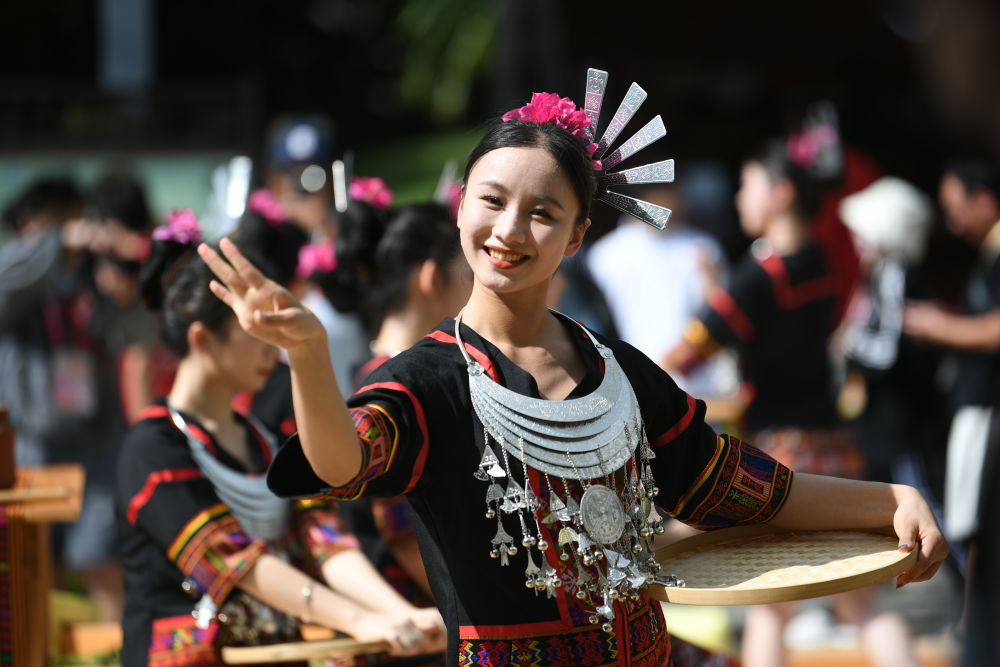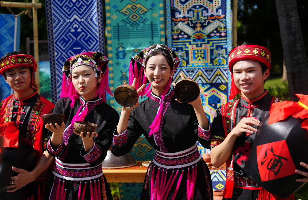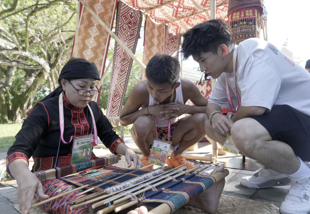 ↑演员(左)在活动中为代表团成员展示黎族传统纺染织秀技艺。新华社记者 胡超 摄