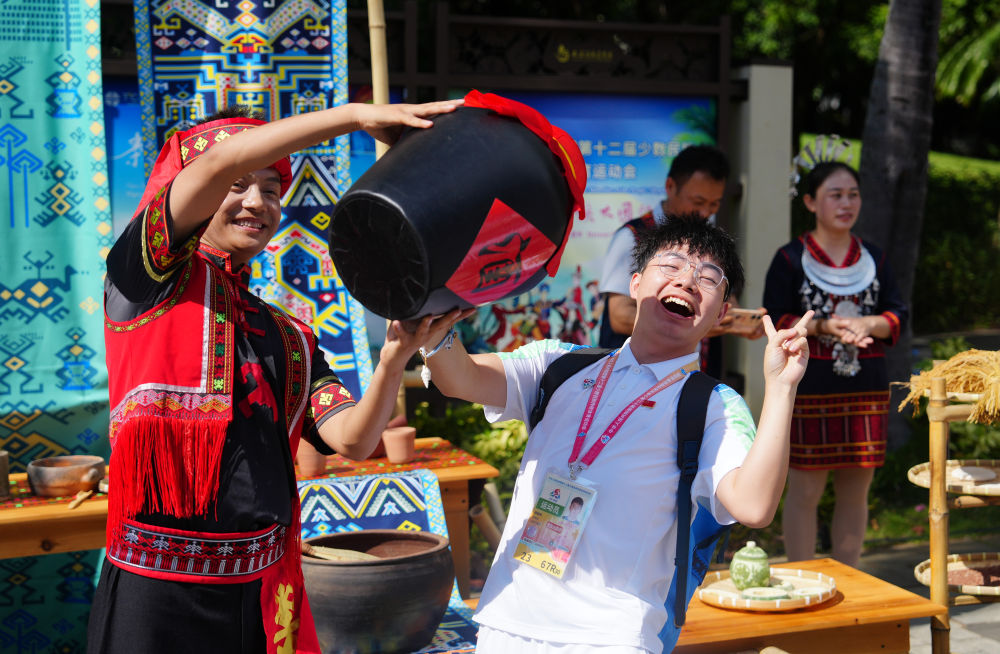 ↑西藏代表团运动员次旺曲珍(右二)和香港代表团运动员卢善衡(左二)在活动中互赠礼物。新华社记者 陈朔 摄