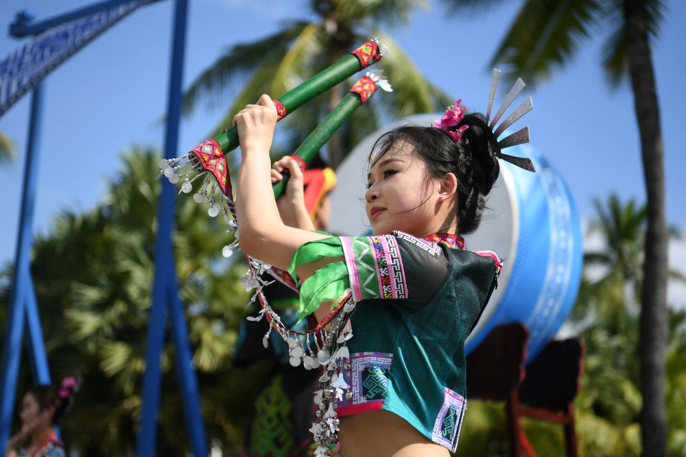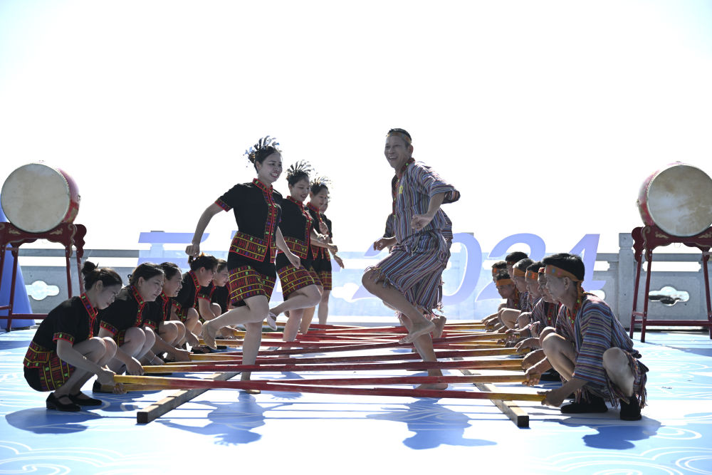 ↑演员在欢迎仪式上表演竹竿舞。新华社记者 张博文 摄