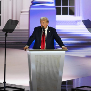 2024年7月18日,美国前总统特朗普在密尔沃基的共和党全国代表大会上发表演讲。(新华社记者 李睿摄)