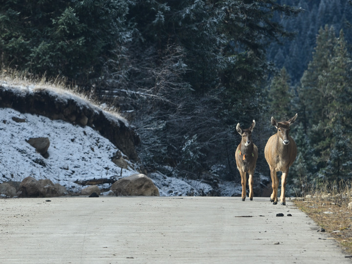 这是11月4日在甘孜藏族自治州德格县多瀑沟景区拍摄的2只国家一级保护动物白唇鹿。新华社记者 王曦 摄