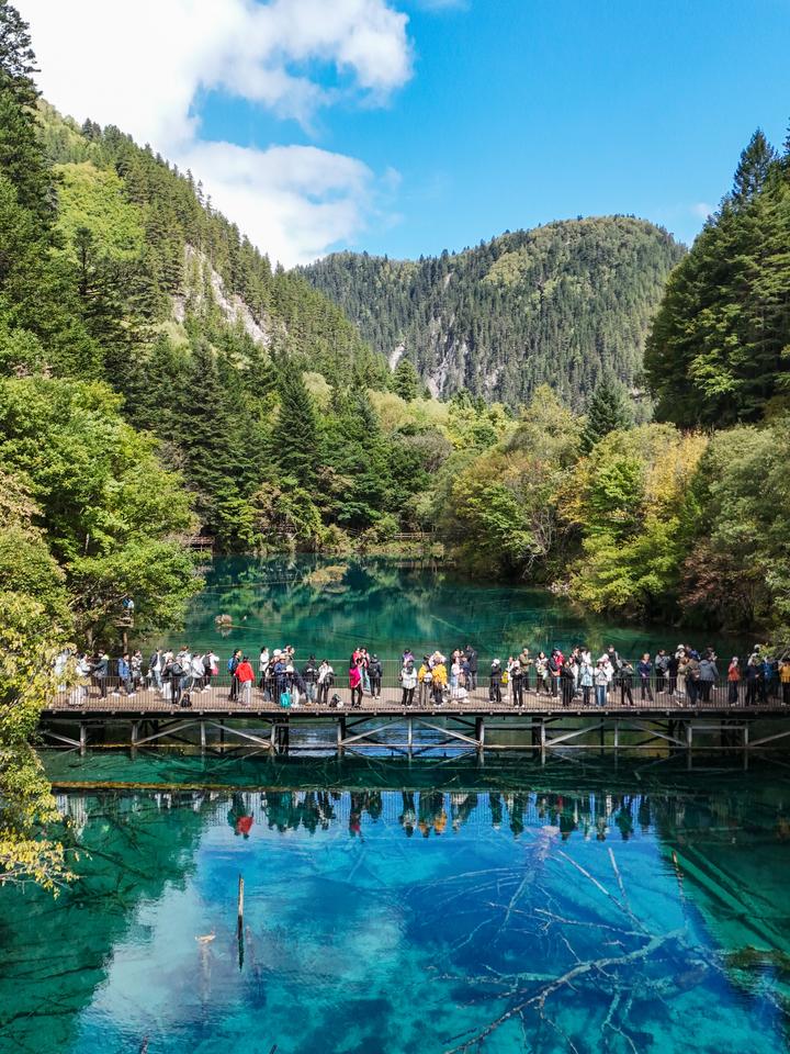 10月10日,游客在九寨沟景区五花海游览观光。新华社记者 王曦 摄