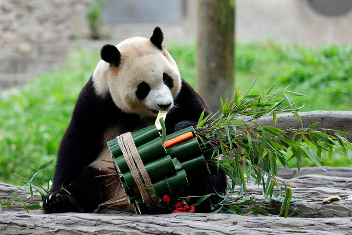 6月12日,大熊猫“福宝”在中国大熊猫保护研究中心卧龙神树坪基地的圈舍进食。新华社记者 沈伯韩 摄