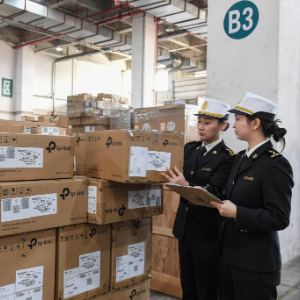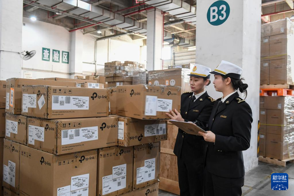 11月27日,在深圳前海综合保税区深圳市美邦国际仓库,蛇口海关关员查验即将出口的货物。