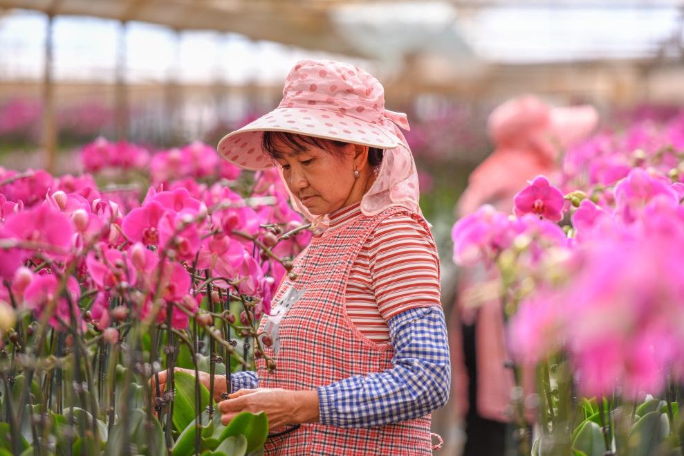 11月25日,在云南芳菲花苑的年宵花基地,工作人员在打理蝴蝶兰。(彭奕凯 摄)