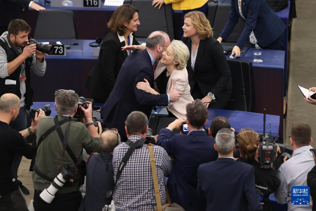 11月27日,在法国斯特拉斯堡欧洲议会会议现场,冯德莱恩(中右)在新一届欧盟委员会(欧委会)委员名单投票通过后庆祝。新华社记者 赵丁喆 摄