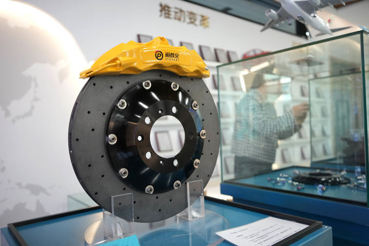 这是在山东道普安制动材料有限公司展示的碳陶刹车盘产品(2024年10月23日摄)。新华社记者 徐速绘 摄