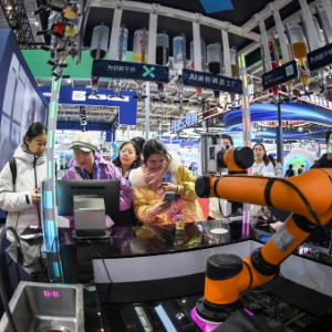 11月27日,人们在第二届中国国际供应链促进博览会先进制造链展区西门子展台参观AI迷你调酒工厂。新华社记者 张豪夫 摄